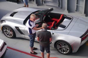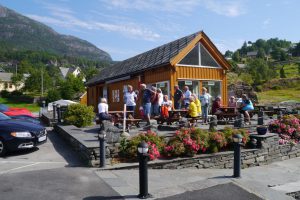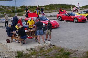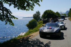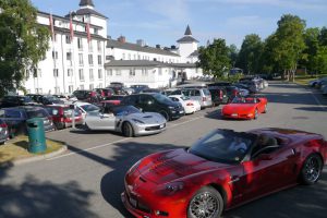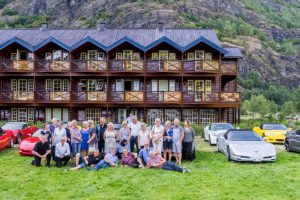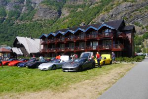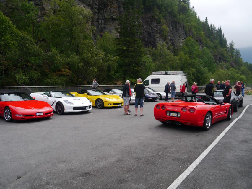 Förflyttning till Flåm och Flåmsbrygga hotell stod på programmet. Vi ville vara framme i så god tid att de som ville ta en tur med Flåmsbanan skulle hinna det innan middagen. Under vägen blev det ändå stopp vid några fantastiska vattenfall, Skjervsfossen och Tvinnefossen. Därtill en tur upp i Myrkdalen mot Vikafjell för att det är en av Norges vackraste vägar. Här passerades också Stalheimskleiva som nämndes i början. Vid hotellet så fick vi bästa parkeringen, på gräset mellan hotellet och kajen för lyxkryssare. De flera tusen passagerarna på båten hade det finaste fotoobjektet man kan tänka sig. Tolv vackra Corvetter uppställda vid en av de vackraste byggnaderna med en bakgrund som inte går av för hackor den heller.
