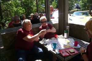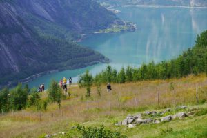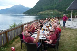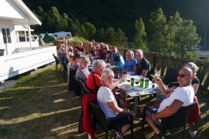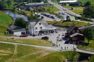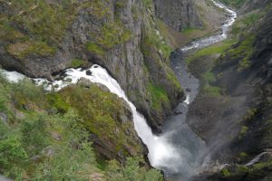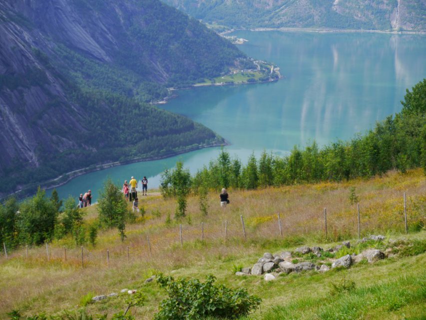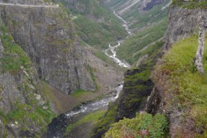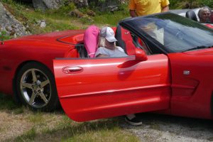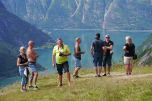 Vidare över Hauklifjell, Odda och till nästa boende i Kinsarvik. Här skulle vi bo i tre nätter så två hela dar att göra utflykter på, härligt. Den från 1650-talet gamla fjällgården Kjeåsen, 530 meter över Eidsfjorden är en av de vackraste, så den får man inte missa. Idag är det en enkelriktad tunnel som gäller för oss bilburna. Tunneln som är öppen en halvtimme åt gången i en riktning kom till tack vare att kraftbolagen byggde dammar för vatten ovanför Kjeåsen. På vägen ner med tolv Corvetter så får vi möte i tunneln. I den bilen som trängde upp sig mot bergväggen blev de en erfarenhet rikare, läsa noga på skylten. Hur mötet med bussen gick, som åkte ner alldeles efter oss vet vi inte, men det blev säkert spännande. Vöringsfossen med lodrät fallhöjd på 145 meter var nästa stopp. Idag utbyggt till en fin turistattraktion med ståltrottoarer, utsiktsterasser, bänkar för att vi skall må bra när vi hänförs över den fantastiska naturen. Det fattas en gångbro över vattenfallet, men den håller på att byggas. Vi såg några bergborrare som hängde i selar över vattenfallet i färd med att bygga ett av brofästena.