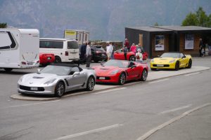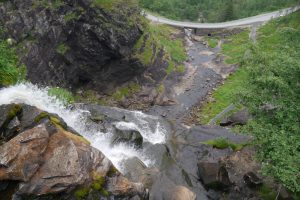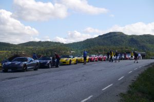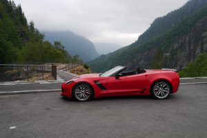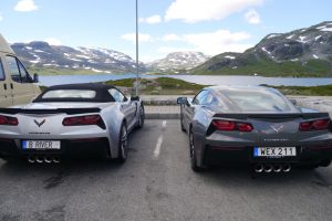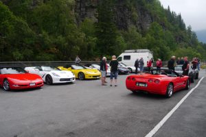 En av de mest spektakulära vägarna i Norge är den vid Stalheimskleiva. Med 20 % lutning så är det en av Norges brantaste vägar. Detta är en del av gamla E-16 mellan Oslo och Bergen som här går i 13 st serpentinkurvor. Nuvarande E-16 går i tunnlar så den gamla är numer enkelriktad nedåt. Det var tur det, före oss i tolv Corvetter så rullar det två turistbussar som skall stanna här och där så passagerarna får sina bilder på vattenfall, höga berg och djupa dalar. Vi fick ju också chansen att njuta av den bedårande utsikten på de nästan upp till 1500 meter höga bergen ner mot Gudvangen.