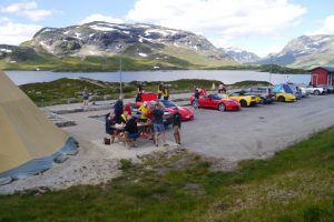 Nu återstod bara två hemresedagar. Vi tog naturligvis turistvägen upp 1300 m över Aurlandsfjellet med sina attraktioner. Limträbron vid Stegastein som går 30 meter ut med utsikten 650 meter över Aurland är ett givet stopp och vid björnen som ligger på soporna inne i berget ett annat. När vi passerade Fagernäs var det marknad så naturligvis tog vi vägen genom byn så alla kunde beskåda våra klenoder till allas förtjusning. Det är inte speciellt vanligt med så här många exklusiva fordon på en rad i Norge. Fram till Lillehammer och sista natten med gänget. En mycket god middagsbuffé och sen en vandring i byn i den ljumma kvällen. En fin avslutning på en fantastisk vecka. Bästa vädret någonsin med kanske en timme duggregn och bästa kompisar där vi aldrig hörde några sura miner, alla var lyckliga och glada.