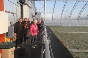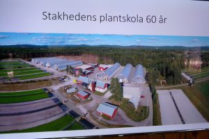Onsdag den 8 maj 2019. Vi utgick från Borlänge för vidare körning till Nyhammar och Stakhedens plantskola. Vi blev 5 st. bilar i det kalla vädret med snön hängande i luften. Innan vi var framme hade molnen skingrats och solen sken från en klarblå himmel, så det var vackra vyer efter vägen runt sjöarna Björken och Bysjön i Grangärde. Vi togs emot av platschef Peter Forsberg som höll en information om plantskolans utveckling sedan starten 1958. Stakhedens plantskola odlar gran och tallplantor till skogsägare för utplantering. 1958 på friland för att idag utökats till 9 st växthus på 25 x 100 meter och en produktion av 27 miljoner plantor. Under några år på 90-talet odlades även gurka på en del av anläggningen. År 2004 blev plantskolan ett dotterbolag till Sveaskog. Intressant att höra hur man kan påverka plantornas tillväxt med värme och kyla och att mörklägga hela växthus. Efter information och kaffe med smörgåsar gick vi en rundtur på anläggningen och fick se planteringslinjen där fröna hamnade i kasetter för tillväxt. Sedan fryses de in och levereras under nästa vår. Innan vi skiljdes åt för kvällen värmde vi oss med en påtår i plantskolans matsal, för det var en kylig vårkväll.