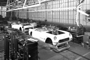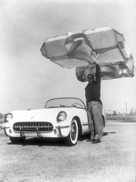 1953 Chevrolet Corvette kommer alltid att bli ihågkommen som den första modellen av en amerikansk sportbil som många beundrade. Under efterkrigstiden köpte amerikaner europeiska sportbilar som den populära MG TD, som hade 7 449 enheter registrerade i USA 1952. Jaguar XK120 var också populär i USA. Harley Earl, chefen för General Motors design, låg bakom utvecklingen av 1953 års Corvette. 1951 hade Earl på allvar funderat på att utveckla en billig sportbil. I början av processen samlade han några stora talanger för att göra GM:s tvåsitsiga sportbil till en dröm. Teamet inkluderade Vincent Kaptur, Sr., som ledde chassieteknik; Carl Peebles, ritaren som gjorde många av Harley Earls idéer till verklighet; Bill Bloch, en lermodellerare; Tony Balthasar; och en ung ingenjör vid namn Robert McLean, som lade fram den unika chassidesignen.Efter att ingenjörs- och designteamet arbetat fram en färdig idé tillkännagavs att karossen skulle tillverkas med glasfiber. I april 1953 grundade Bob Morrison ett nytt företag kallat Molded Fibre Glass Body Company, som började planera och bygga en 30 000 kvadratmeter stor fabrik för att tillverka de delar som Chevrolet behövde för Corvette-kroppsmonteringen. De första tillverkade Corvette-modellerna var sammansatta av ett relativt stort antal separata GRP-delar eftersom Chevrolet-ingenjörerna hade planerat tillverkning genom den matchade metallformprocessen. 1953 års Corvette, en snygg tvåsitsig, blev USA:s första masstillverkade sportbil i glasfiber. Totalt tillverkades 300 enheter det första året. Den första Corvette-modellen kom från linjen i Flint, Michigan den 30 juni 1953 innan produktionen flyttade till Chevrolet-fabriken i St. Louis, Missouri i december 1953. Earl och andra var upptagna med att slutföra sätt att få den nya Corvetten med på GM:s årliga Motorama-bilmässa för media och allmänheten att se och granska. Displaymodellen tillverkades i Polo White med Sportsman röda säten som såg bra ut. Motorama-mässan var en stor framgång, där GM fick förfrågningar från hela världen om när Corvette kommer att vara tillgänglig för allmänheten och till vilken kostnad. Efter godkännandet av GM:s president Harlow Curtice, skulle Chevrolet Corvette gå i produktion så snart som möjligt.1953 års Corvette-modeller var i grunden handgjorda med Chevrolet Bel Air hjulkåpor, tillsammans med whitewall-däck, en komplett instrumentpanel med en elektrisk klocka, en 5000-rpm varvräknare och flera andra funktioner. A