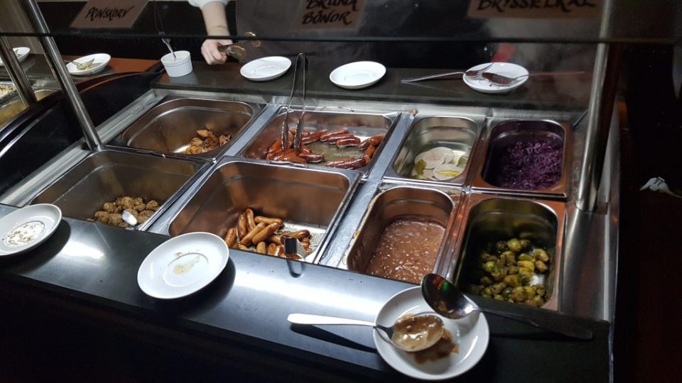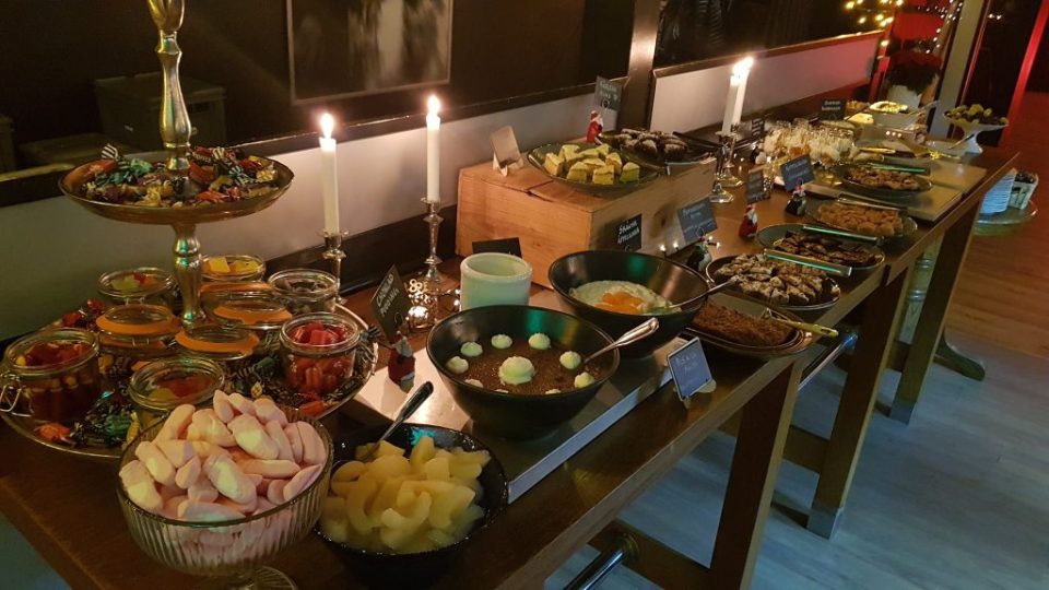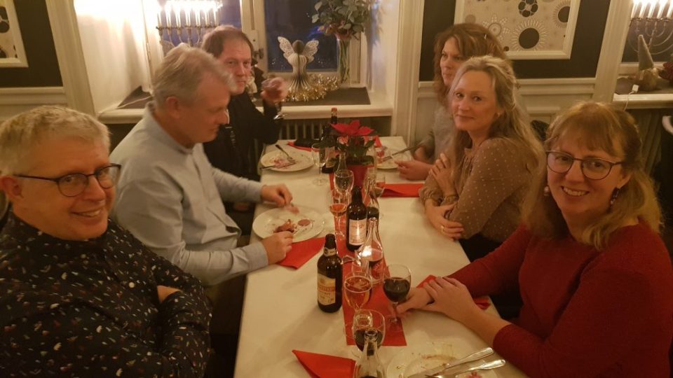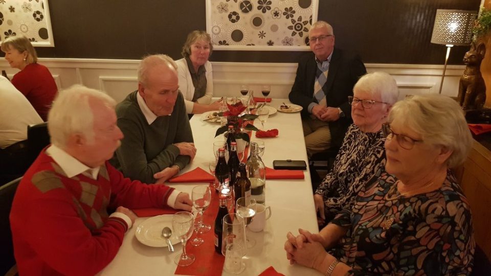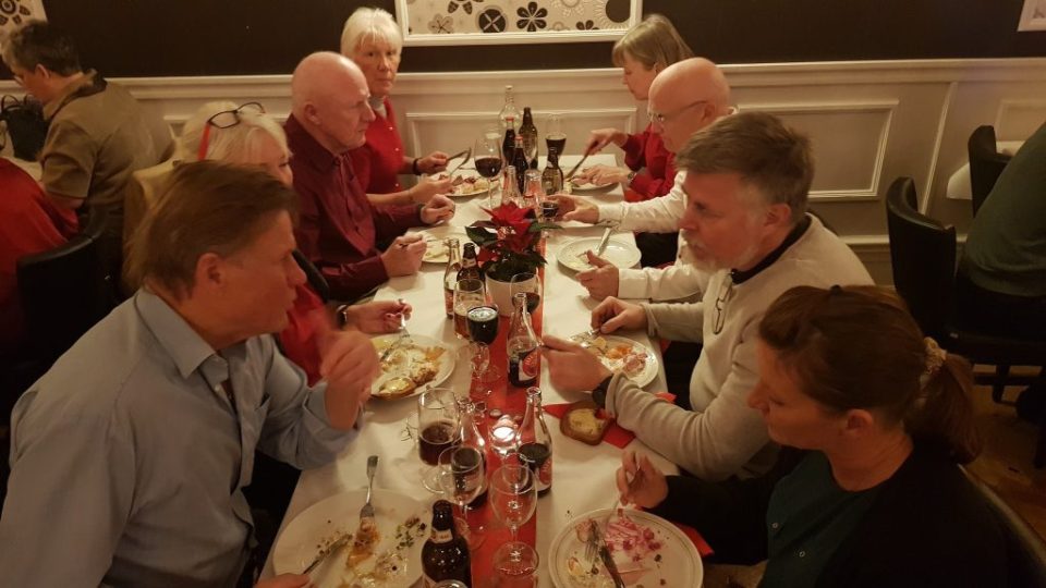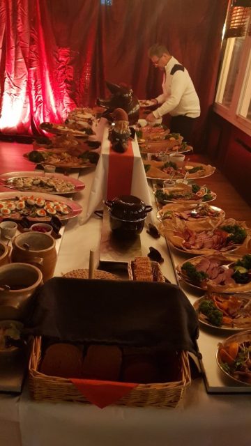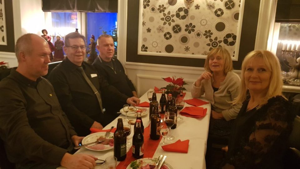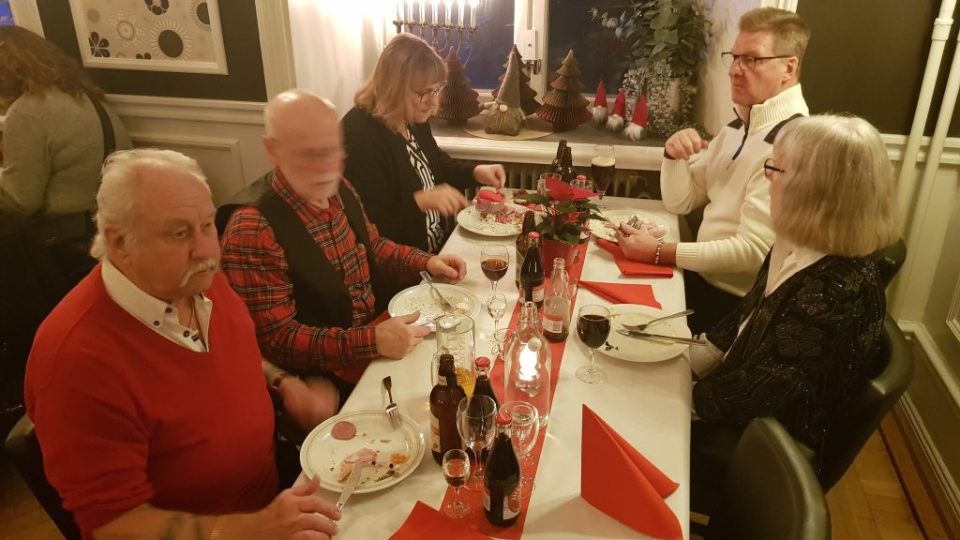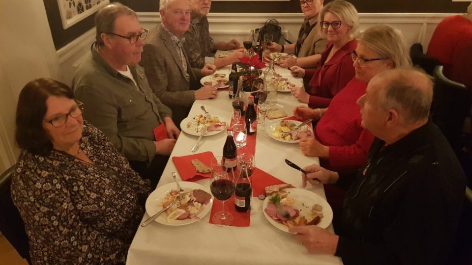 Först lite Glöggmingel i baren sen flyttade vi in i Matsalen till våra dukade bord. Vartefter hämtades gobitar från den uppdukade buffe’n. Stämningen blev snabbt högt i tak när alla åt och samtalade med varandra.