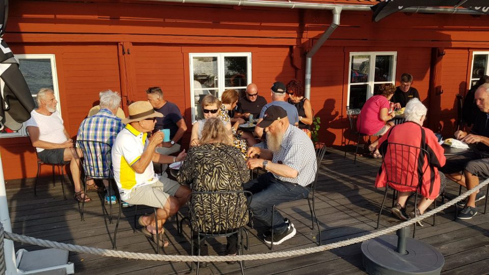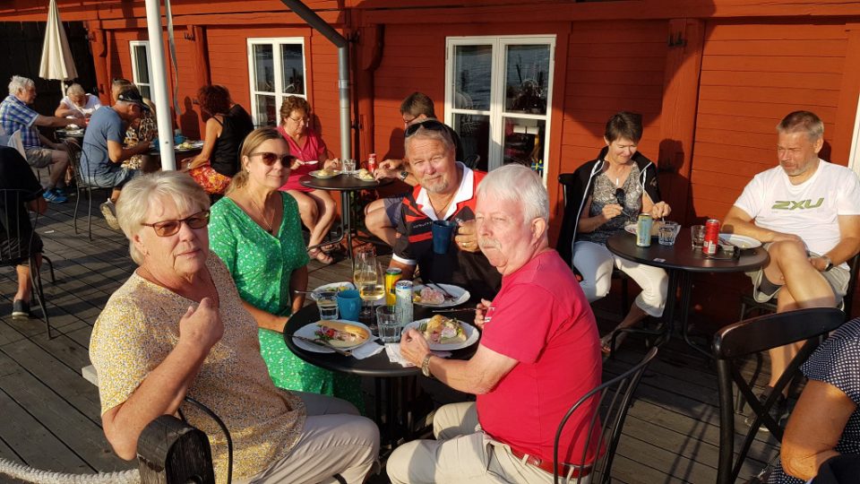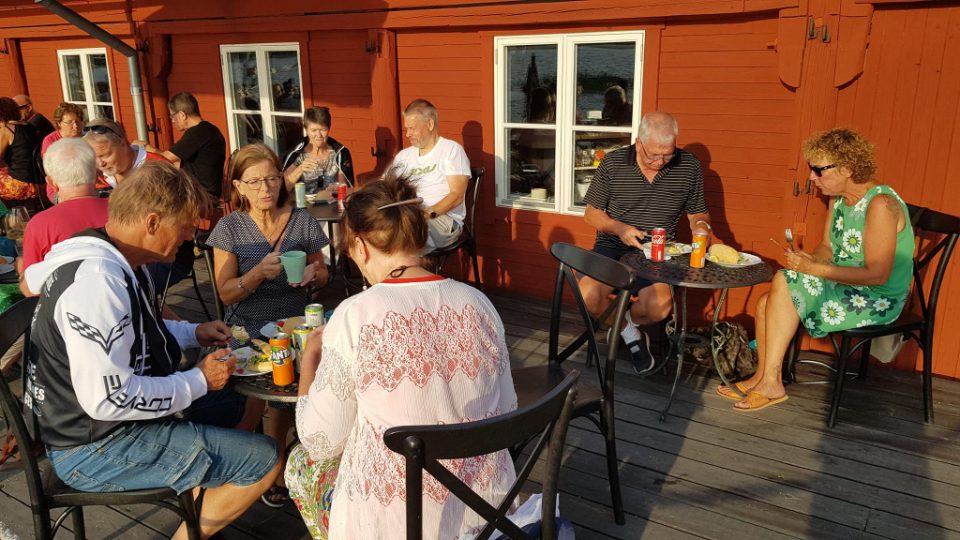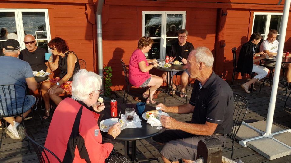 Väl framme hade vi en parkeringsplats bokad på gräsmattan precis intill cafét. Alla gästerna kunde nu gå in och hämta de beställda godbitarna samt gå ut och ta plats vid våra bord i kvällssolen på kajkanten.