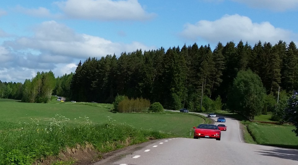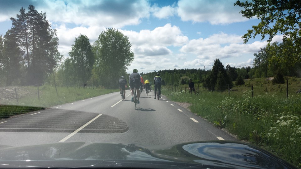 Men att vi inte var ensamma om att ha planerat en runda i de trakterna började vi misstänka när vi i en korsning fick se två herrar sitta vid ett labyrintspel och uppenbarligen vänta på något. Kanske något MC-gäng? Strax senare blev vi riktigt oroliga när hundratals cyklister swischade förbi på vägen vi strax skulle svänga in på. Som vanligt när MickeLina ska arrangera en CCS-tur så går ett större cykellopp samtidigt! Cyklar tar förvånansvärt mycket plats, och vägarna var kanske inte helt optimala för omkörningar. Många verkade dessutom sitta på en cykel för första gången, det var flera gånger riktigt nära att våra fina bilar skulle bli repade när någon lycraförsedd motionär vinglade till.