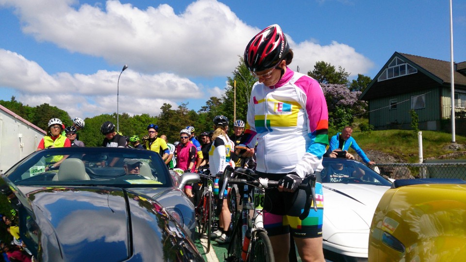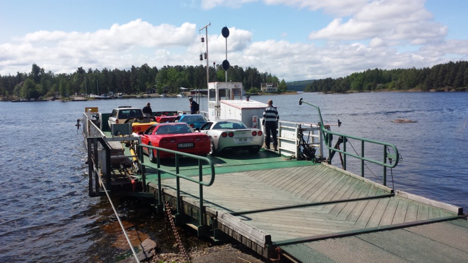 Vi lämnade dock den mest cykeltäta vägen och styrde kosan mot Torpön där vi skulle äta lunch, men även på den vägen gick ett annat, mindre cykellopp! Det här ledde till vissa svårigheter för den stackars färjekaptenen som skulle skeppa över våra 19 bilar till Torpöns Camping och den väntande måltiden. Färjan tar nämligen bara 6 bilar åt gången. Kaptenen hade fått order om att fylla färjan med hälften bilar och hälften cyklar, men vår tolkning om att detta skulle innebära 5 Vettar och 5 cyklar föll av någon anledning inte i god jord hos våra tvåhjuliga medtrafikanter.