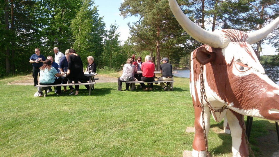 Färjetrasslet innebar att när de sista av oss började ta för sig av lunchen hade de första redan druckit upp kaffet. Nu hade tack och lov vädret övergått till ett riktigt klart solsken, så att sitta en stund extra hade ingen ont av.
