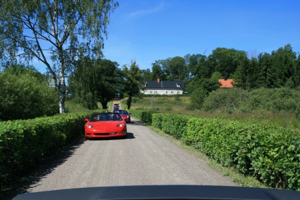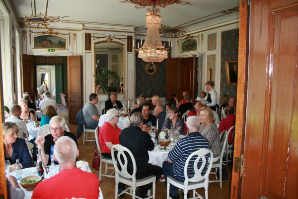 Efter det kom vi ut på lite större vägar på vår färd till Södertuna Slott där vi skulle inta vår lunch. På vissa ställen, såsom här, var det lite trångt för alla våra bilar, men väl på plats fick vi se en fin byggnad som låg vackert nere vid vattnet. Vi blev dock nästintill anfallna av flugor och bromsar. I ett fantastiskt vackert rum fick vi en underbart välsmakande lunch med sallad och bröd, kräftsoppa till förrätt och en varmrätt bestående av ostfylld färsbiff. Innan avfärd fick vi lite historik i musikens spår. Vi fick se 2 till frågor samt gissa omkretsen på en av Sörmlands äldsta ekar, vilket var utslagsfrågan om flera slutade på samma poäng.