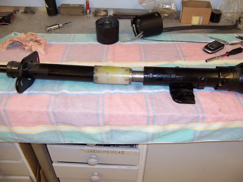 Skämt å sido,min kompis skar ut 2st plattor som passade till rattstångens 2 delar,sen så tog jag 2st gängstänger somlöpte mellan båda plattorna.Ska se om jag inte kan lägga ut några bilder på sakerna i min Pixbox sida.Sedan så hade jag klyvt ett rör på längden som fick bli ett stopp till plast hylsan sedan var det bara att sätta borrmaskinen på gäng stängerna och dra ihop det hela